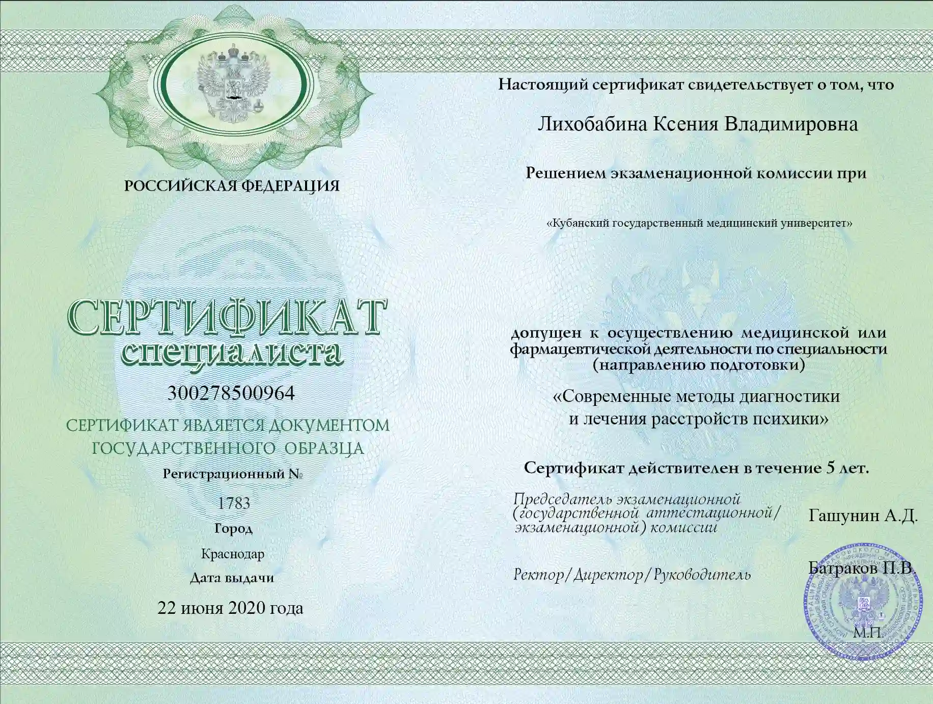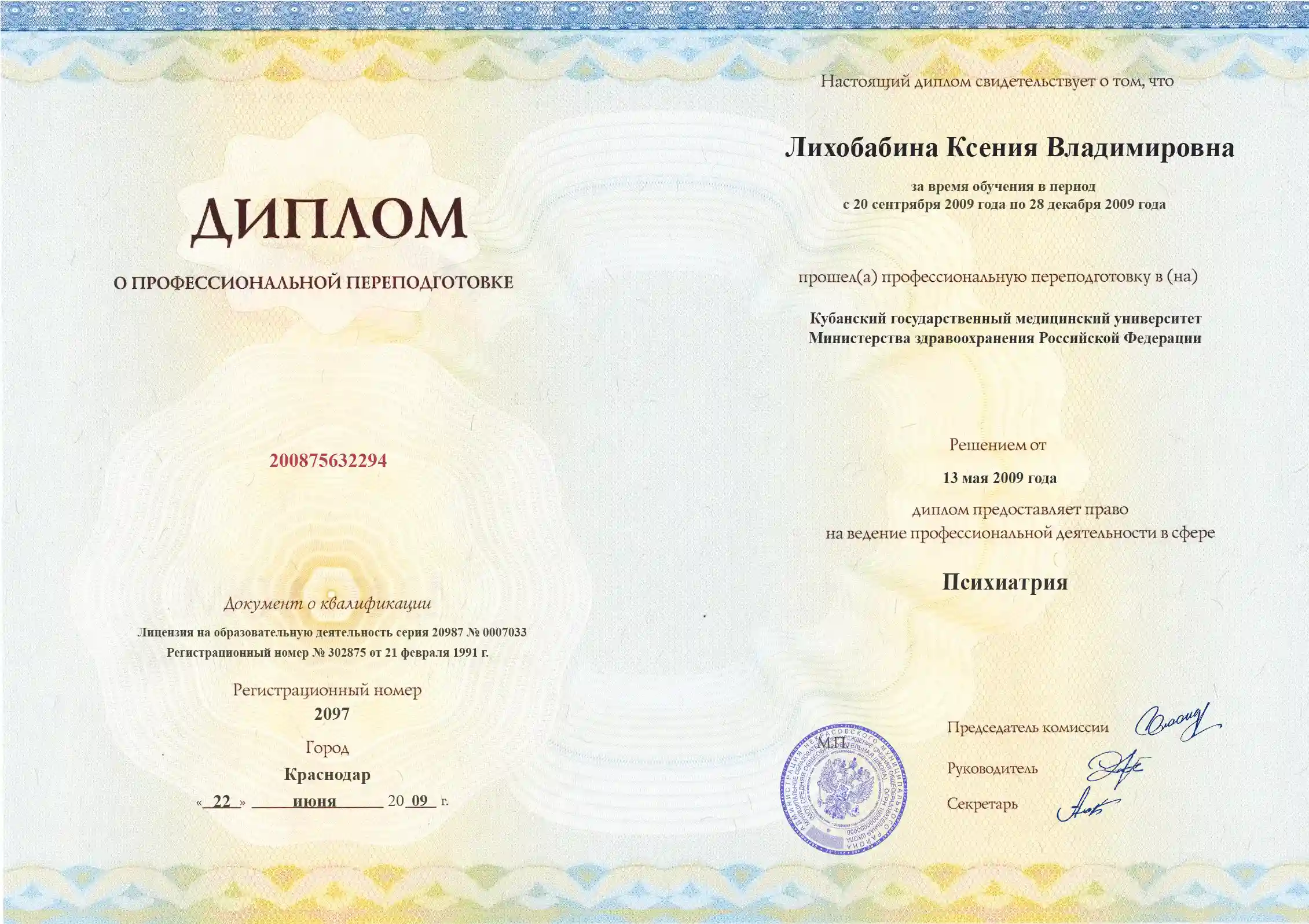 • Должность: Врач психиатр первой категории